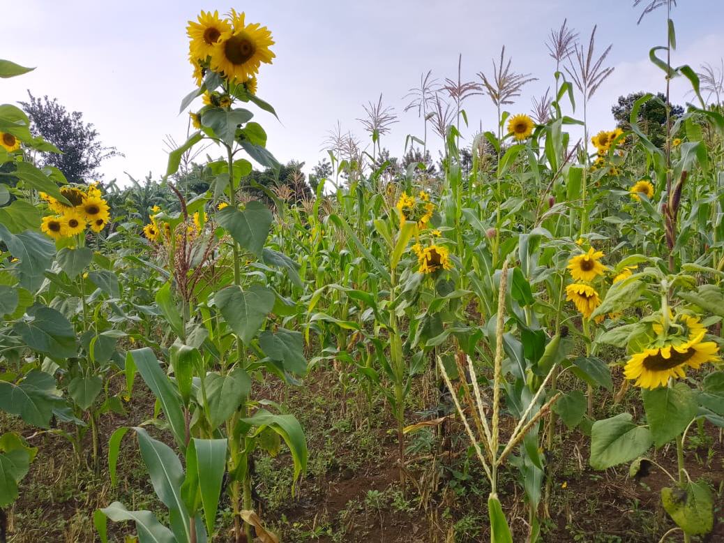 Les tournesols fleurissent au milieu des haricots et du maïs à récolter, le 05. 01. 2026