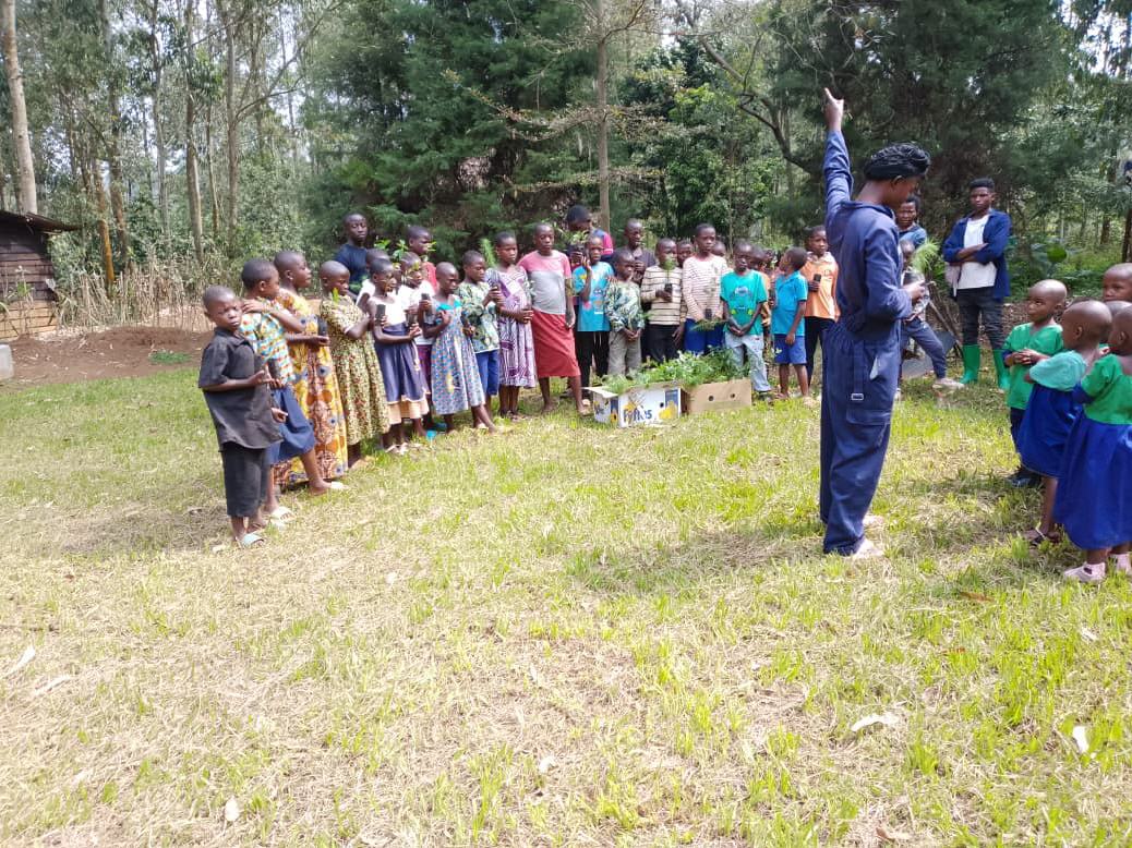 « Roots and Shoots »relient des centaines de milliers d’enfants et de jeunes à travers le monde. Les enfants du FDP sont sensibilisés aux travaux communautaires pour l’environnement et la protection de la forêt équatoriale, le « poumon de la terre ». Claudine Munyerenkana dirige le projet en tant que spécialiste d’une pépinière d’arbres, où les enfants apprennent à planter les arbres et en prennent soin après la plantation. Dans son message par vidéo, le Père Roger souhaite que le programme « Roots and Shoots » soit un modèle pédagogique à inscrire dans les écoles de la région du Sud-Kivu, spécialement celles qui avoisine le parc national de Kahuzi-Biega. Photo : un arbre pour chaque enfant, le 19/01/2026.