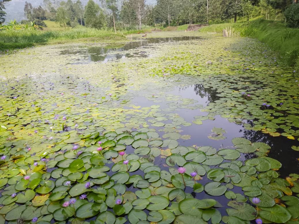 Trois jeunes Hommes de l’équipe environnementale ont débarrassé l’étang des nénuphars en trois jours, afin que les petits poissons aient à nouveau assez de lumière et de nourriture.