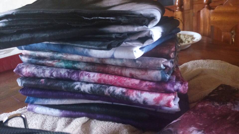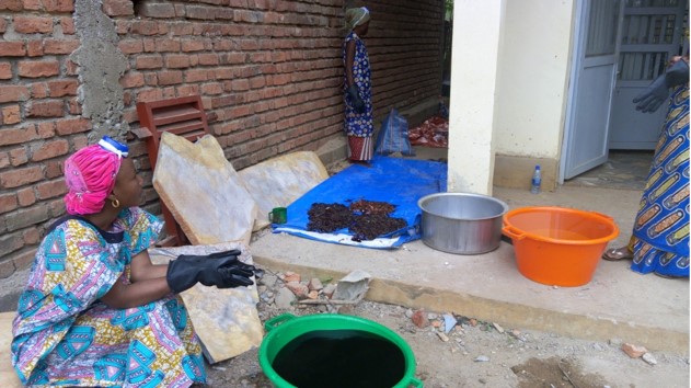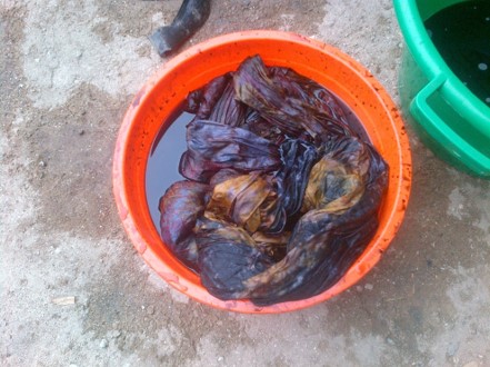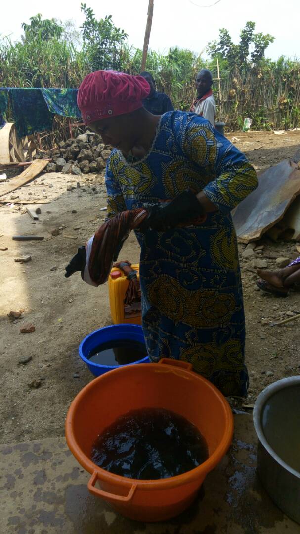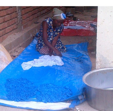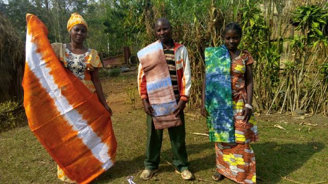 Nach der Feier begann die Ausbildung in Handarbeit! Monique, die Schwester von P. Roger, und zwei weitere Lehrerinnen lehrten die Frauen Umschlagtücher in afrikanischen Muster und Farben zu färben.