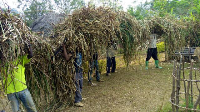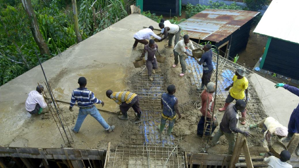 Nach der Diplomierung sind die Jungen, ehemaligen Kindersoldaten an der Arbeit: beim Bau des Mehrzweckgebäudes in Kambehe. Das Zentrum benötigt genügend Raum für das Schneideratelier und für andere, interkulturelle Aktivitäten.