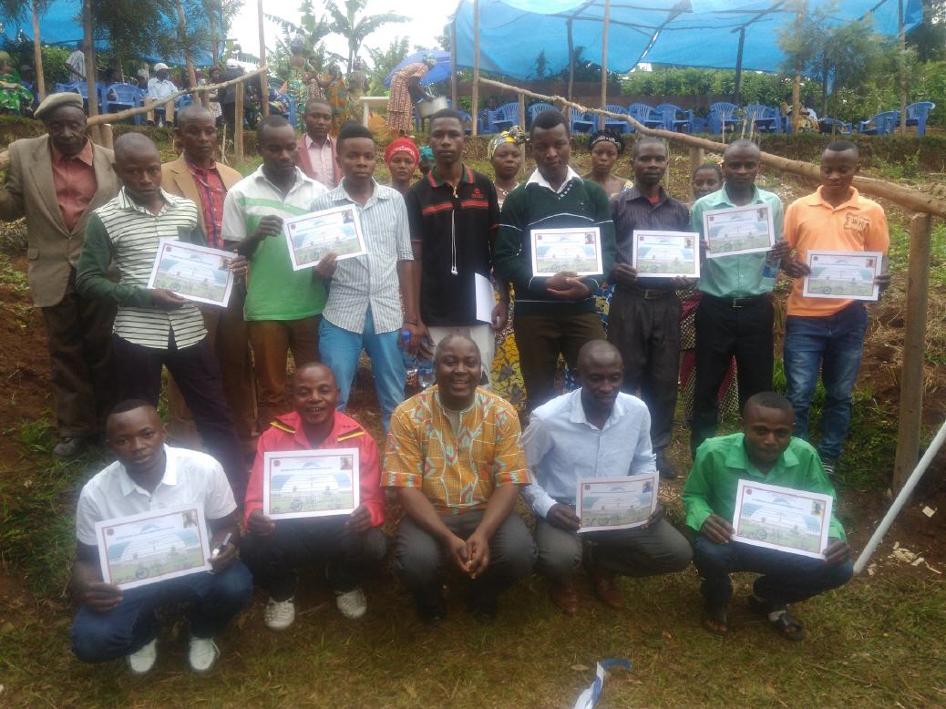 Le 8 mars était aussi une grande journée pour la troisième équipe des ex-enfants soldats et leurs familles. Ils ont célébré la fin de leur formation professionnelle à l’école St. Joseph à Murhesa : 3 en maçonnerie, 8 en mécanique automobile, 1 en menuiserie et 1en coup couture ! Au début de l’année, ils étaient14, 13 ont fini la formation. 11 sur 13 ont obtenu leurs brevets et deux ont échoué.