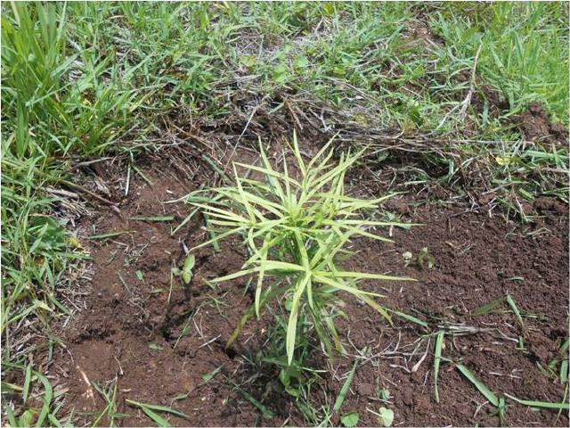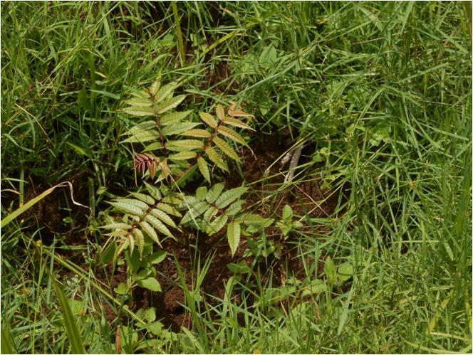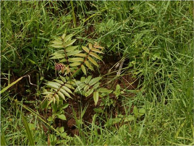 Le désherbage vise à sauver ces plantules d'arbres en plaine croissance. A gauche l'essence de podocalypus et à droite celle de Marcamia