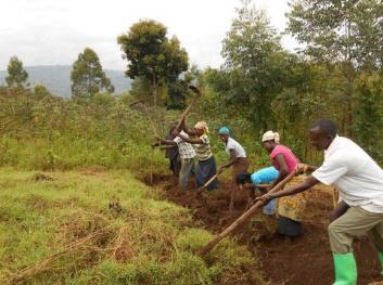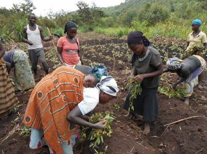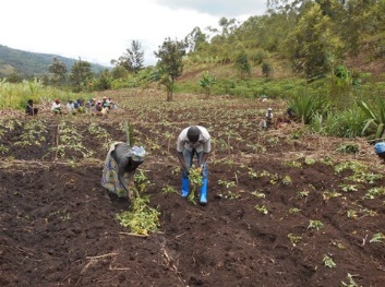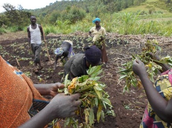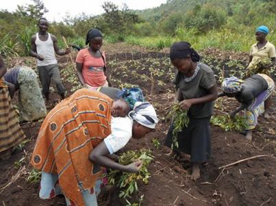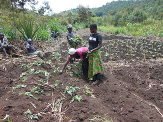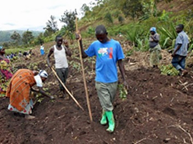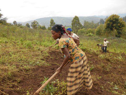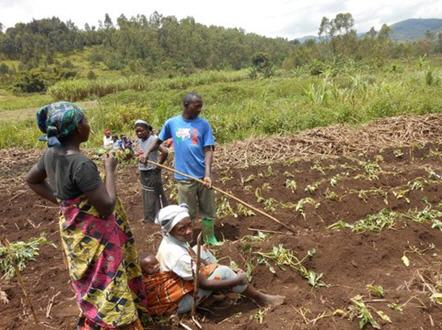Die Frauen bearbeiten mit Hilfe der Jungen ihr Grundstück am Rand des Flusses bei Bushumba, wo die Erde mineralienreich und fruchtbar ist.